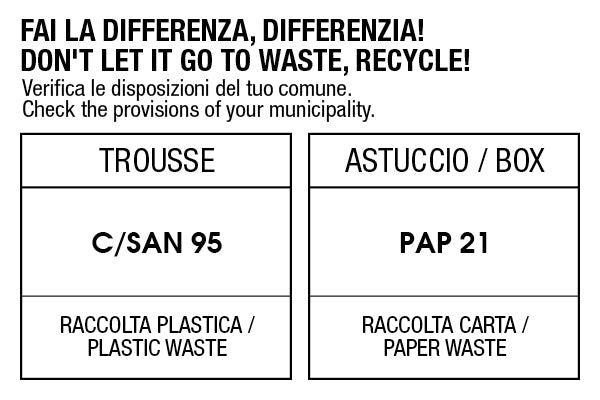 The eyeshadow adheres perfectly to the eyelid for a long-lasting effect. It is also enriched with vitamin E which gives antioxidant and anti-aging properties, and olive oil, with emollient properties.